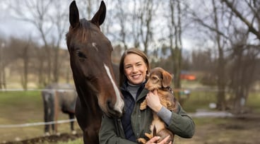 Anna är nära kunderna i Sundsvall: ”Jag kan fokusera på en bransch jag verkligen förstår” Anna Östlund står på ett fält med ladugårdsbyggnad i bakgrunden